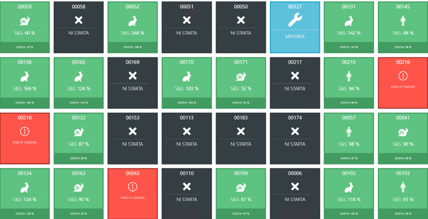 - Spremljanje OEE v realnem času: Obveščanje na nivoju vsake delovne operacije in delovnega mesta. Nudimo vpoglede delovanje strojev in zastojev, ki omogočajo sprejemanje bolj informiranih odločitev.